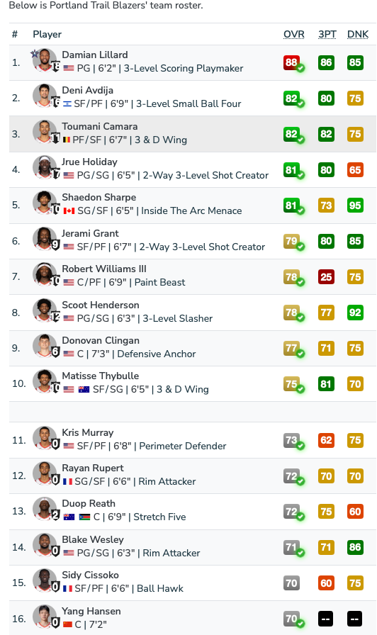 雷速体育8月30日讯 NBA 2K官方今日公布了联盟各队的2K26能力值,其中开拓者队无人能力值超过90分,但是有5人能力值超过80分,中国球员杨瀚森70分,以下是具体名单:
